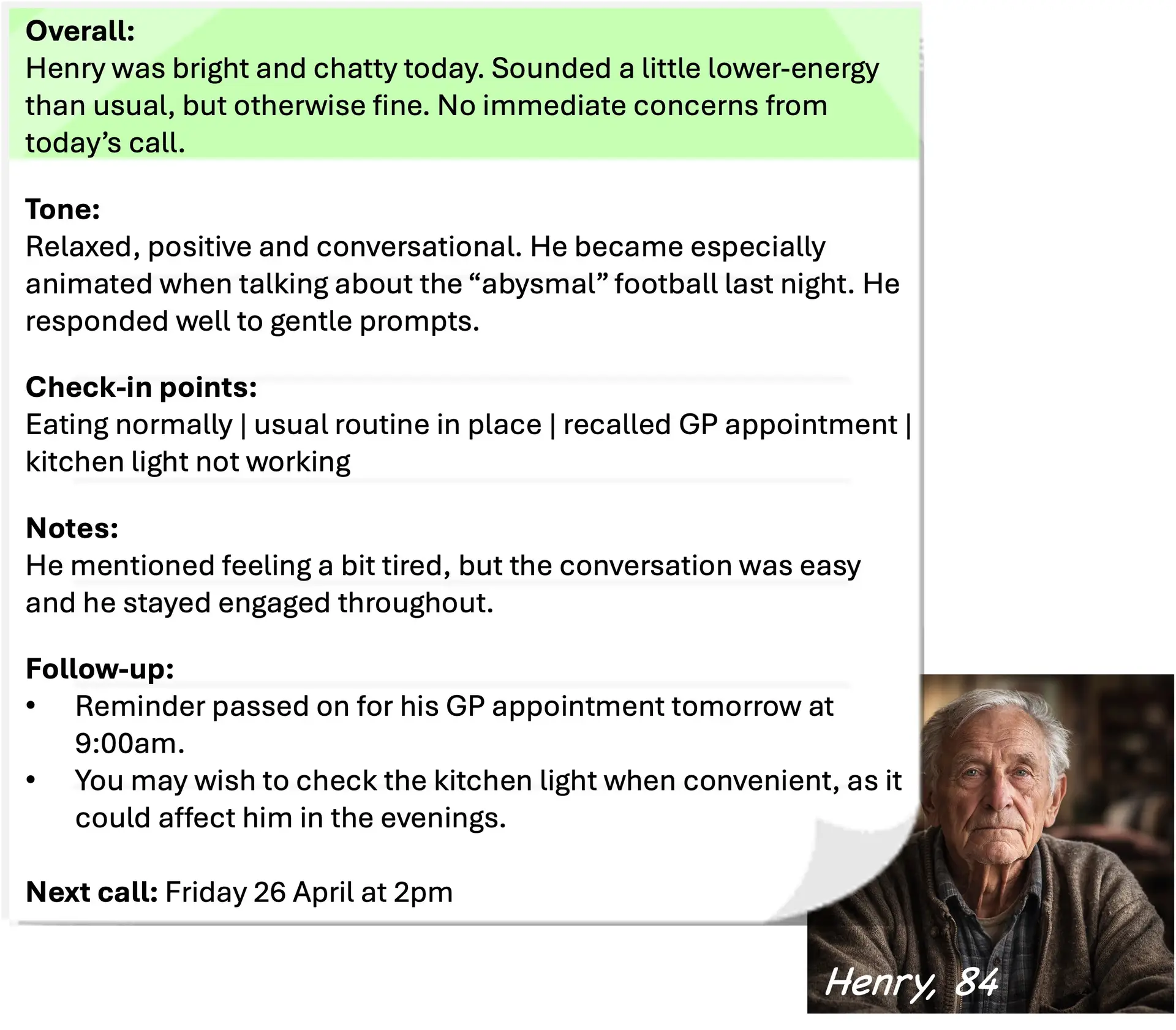 Many older parents live alone and it can be difficult to stay informed between calls and visits. We send you a high-level call note – just what matters, without oversharing.
